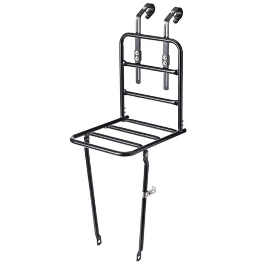 The Basil Front carrier is a large and strong front carrier, perfect for a men's or women's bicycle. It is an accessory that works well on a city bicycle. Your bicycle crate will fit on this front carrier rack which has a maximum load capacity of 10 kilos. The rack is indispensible when transporting a heavy bag full of groceries or sports gear. The front carrier, which is available in black, is equipped with MIK profiles, so that you can simply click a Basil bicycle crate onto your front carrier and remove it just as easily. The front carrier has brackets for mounting on the front axle, so it cannot be combined with sprung front forks: rather, simply attach the front carrier to the handlebars of your bicycle. It comes with two handlebar hooks, suitable for a diameter of 21 to 31.8 millimetres. In addition, the front carrier is easy to adjust and has a mounting for a bicycle lamp. BASIL FRONT CARRIER L első csomagtartóBasil Front Carrier L első csomagtartó, merev villához, fényes vagy matt fekete színben. Felül a kormányra akasztható, tartórésze MIK profillal, és maximum 10 kg-os terhelést bír el. 26" vagy 28"-os kerékátmérőhöz.