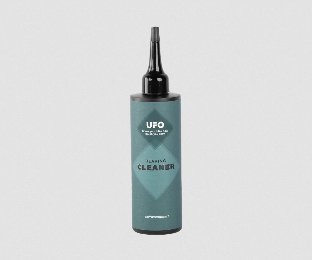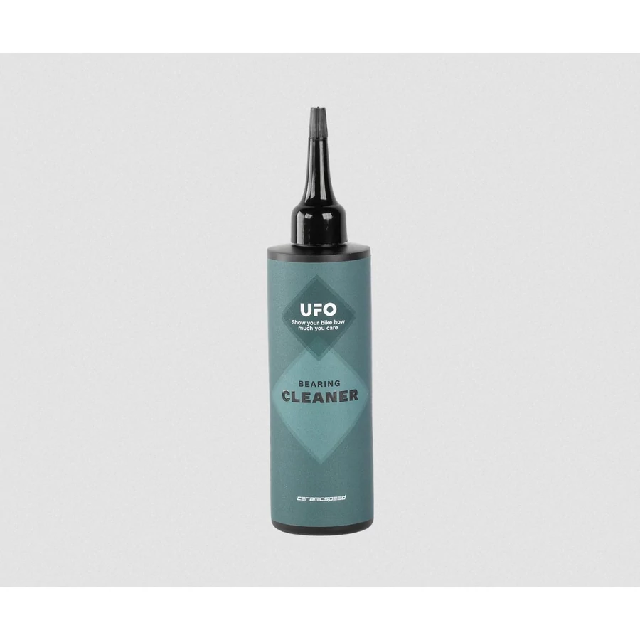 Was developed specifically to clean the types of grease and common contamination found in cycling bearings. As a non-toxic, biodegradable formula, you can clean your bearings with ease and peace of mind without harsh solvents or hazardous leftovers.For cleaning bearings, it is not generally recommended to remove the bearing from its placement. Start by removing any dust shields in front of the bearing and carefully removing the visible seal by inserting a knife blade between the inner race of the bearing and the seal. Apply a couple of drops of UFO Bearing Cleaner directly to the exposed face of the bearing. Rotate the inner race in both directions to agitate the cleaner inside the bearing and break down contaminated grease. Let sit for 2-5 minutes for best results. Use compressed air and a cloth (wear eye protection) to flush out the old grease and cleaner, repeat the process if needed 1-2 times. Once clean and dry, apply one of the three UFO Bearing Grease options based on riding type and conditions, or UFO Bearing Pulley Oil for pulley bearings, and reinstall the seal and dust shields.