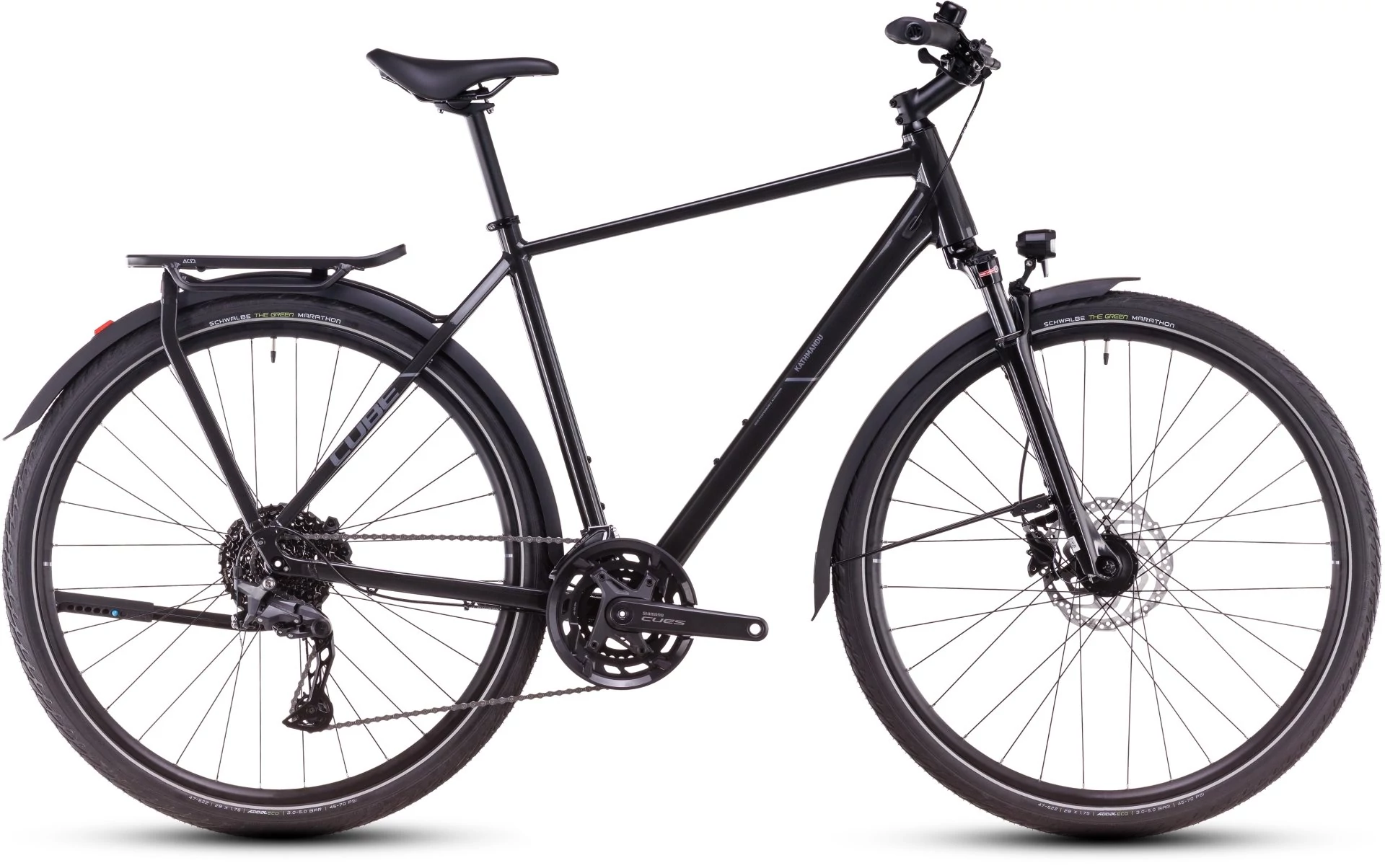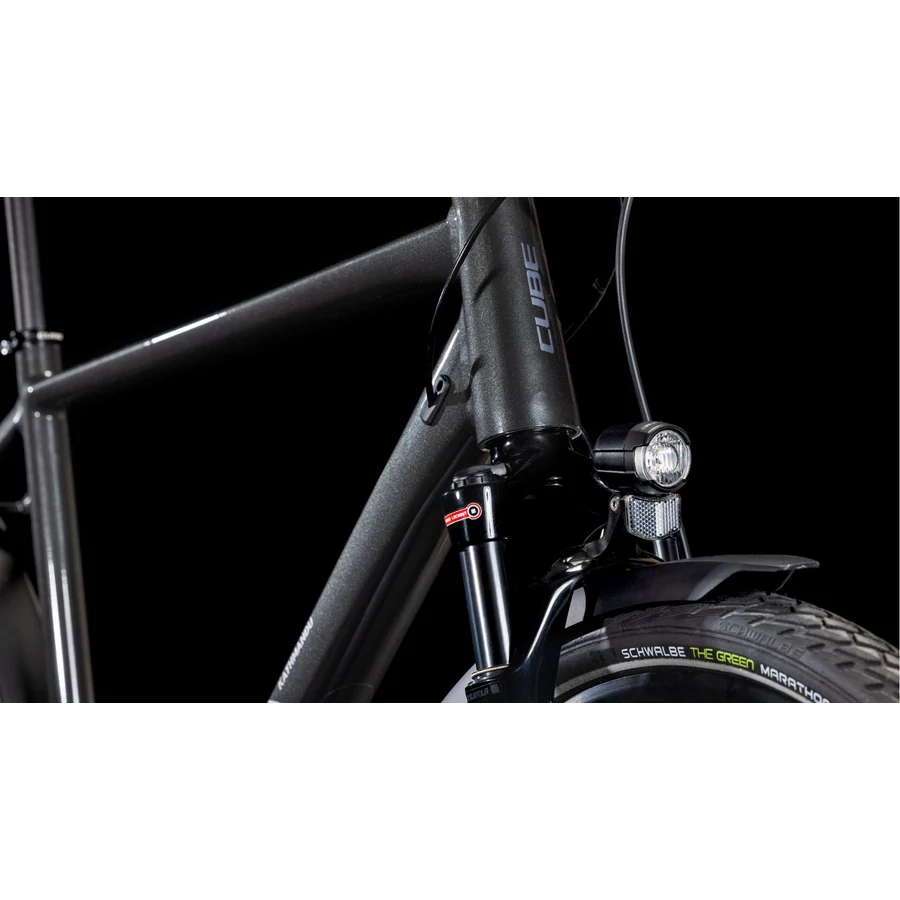 Az SR Suntour NCX D LO Air levegős teleszkópvilla, a Shimano Cues 2x10 váltórendszer, a hidraulikus tárcsafékek és a Schwalbe Marathon Green 47 mm-es külsők együtt gondoskodnak a kényelmes, kontrollált haladásról aszfalton, kerékpárutakon és rosszabb minőségű utakon is. A dinamós világítás, a sárvédők és a kitámasztó miatt a CUBE Kathmandu Pro az első percben készen áll az ingázásra és a túrázásra.