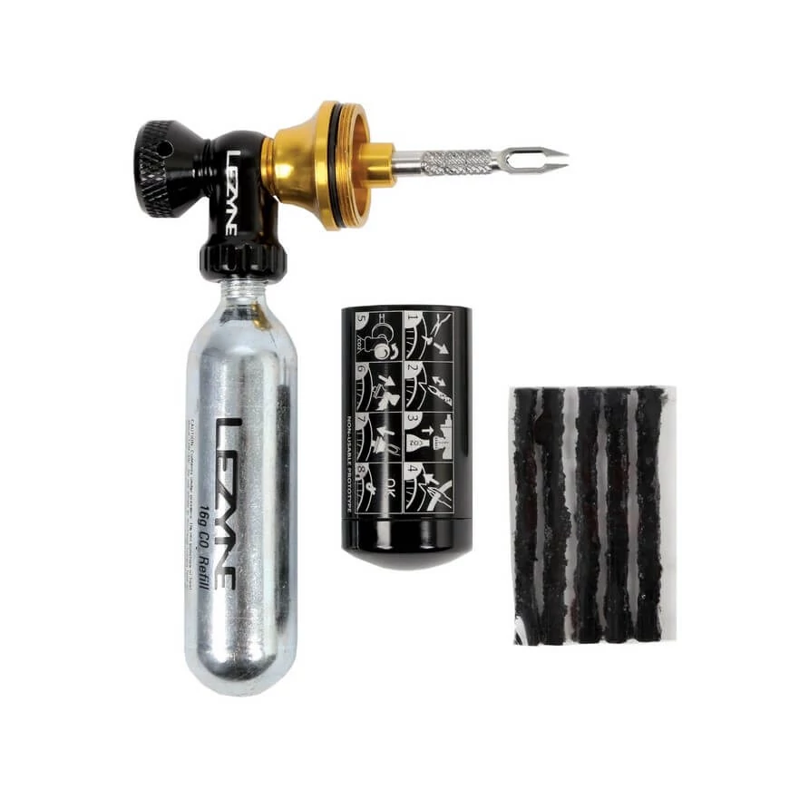 Innovative 2-in-1 cycling CO2 dispenser and tubeless tire repair kit simultaneously inflates and seals tubeless tires. Machined aluminum construction is both lightweight and highly durable. Hardened steel reamer scours hole, inserts plug and inflates tire for an efficient and rapid repair. CNC-machined twist knob manually controls release of CO2 gas. Aluminum canister holds the five included tire plugs and safely stores the reamer when not in use. High quality tire plugs aggressively seal holes that are too large to be sealed by sealant alone (hole size varies from tire to tire). Sleek, compact design fits in a pocket or straps to your bike. Two kit options: Two 20-gram CO2 cartridges or no cartridges, and a simple Velcro strap. Note: Sealing performance may vary based on puncture size, tire size and tire pressure.LEZYNE TUBELESS CO2 BLASTER KIT pumpa és szerszám szettWEIGHT: 63 g (No CO2)
