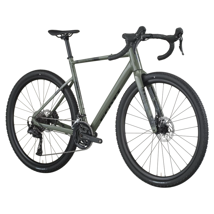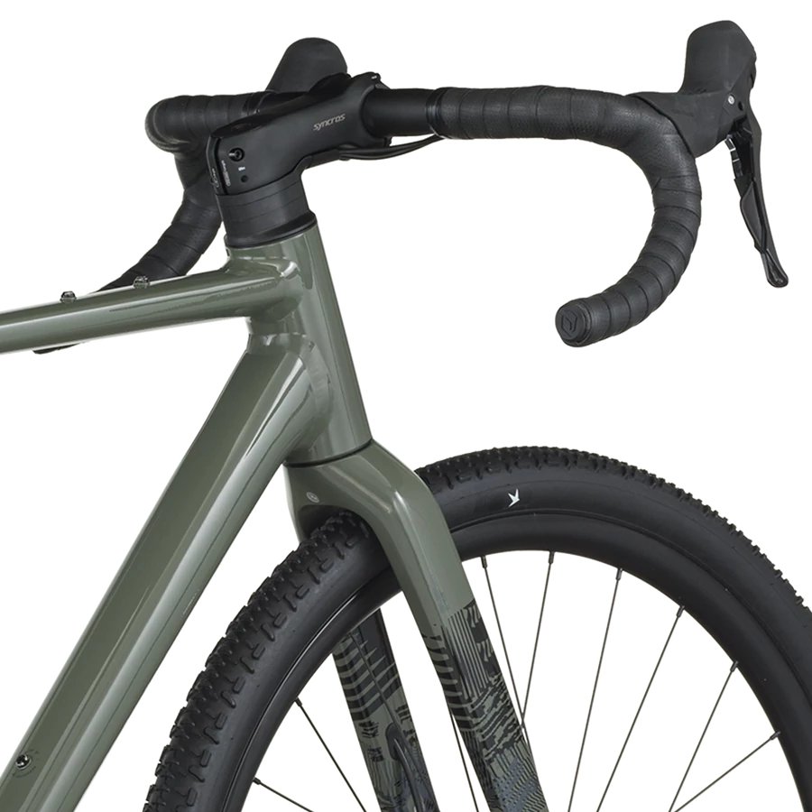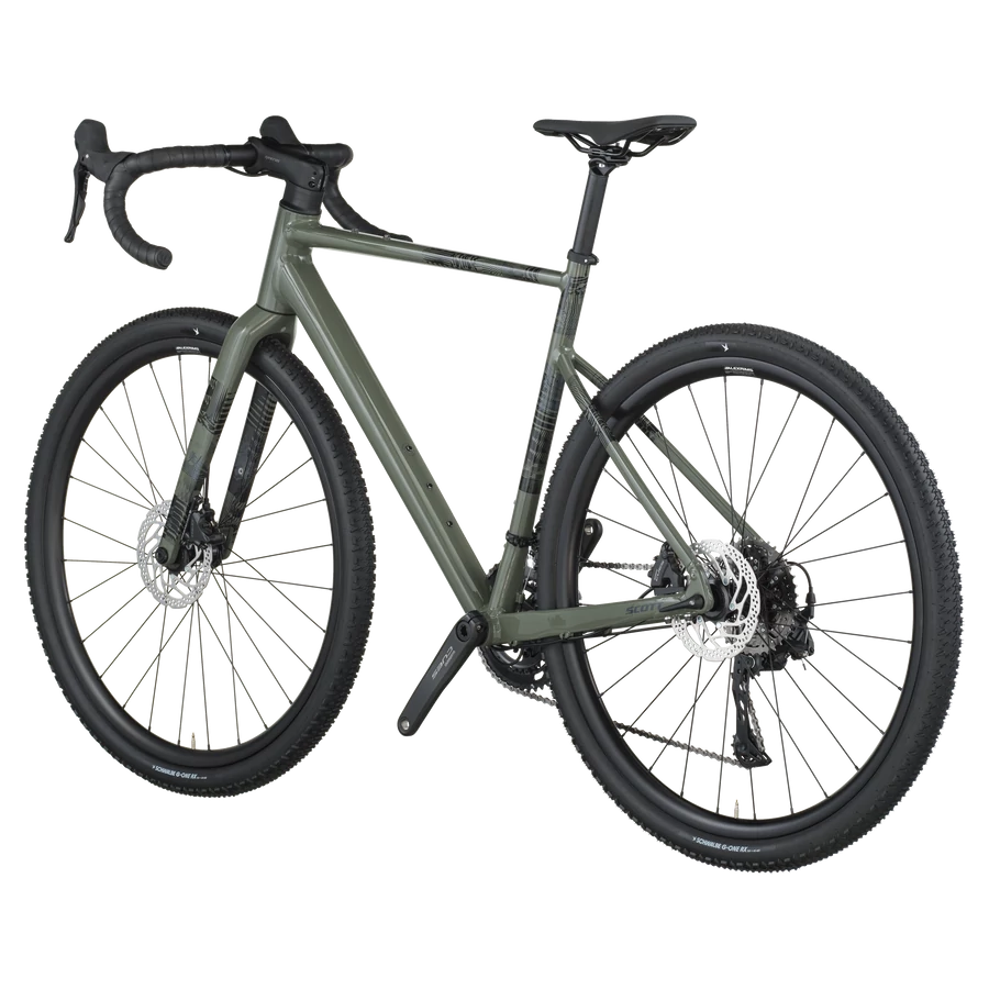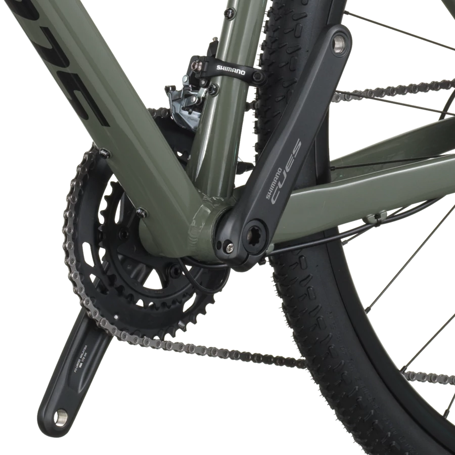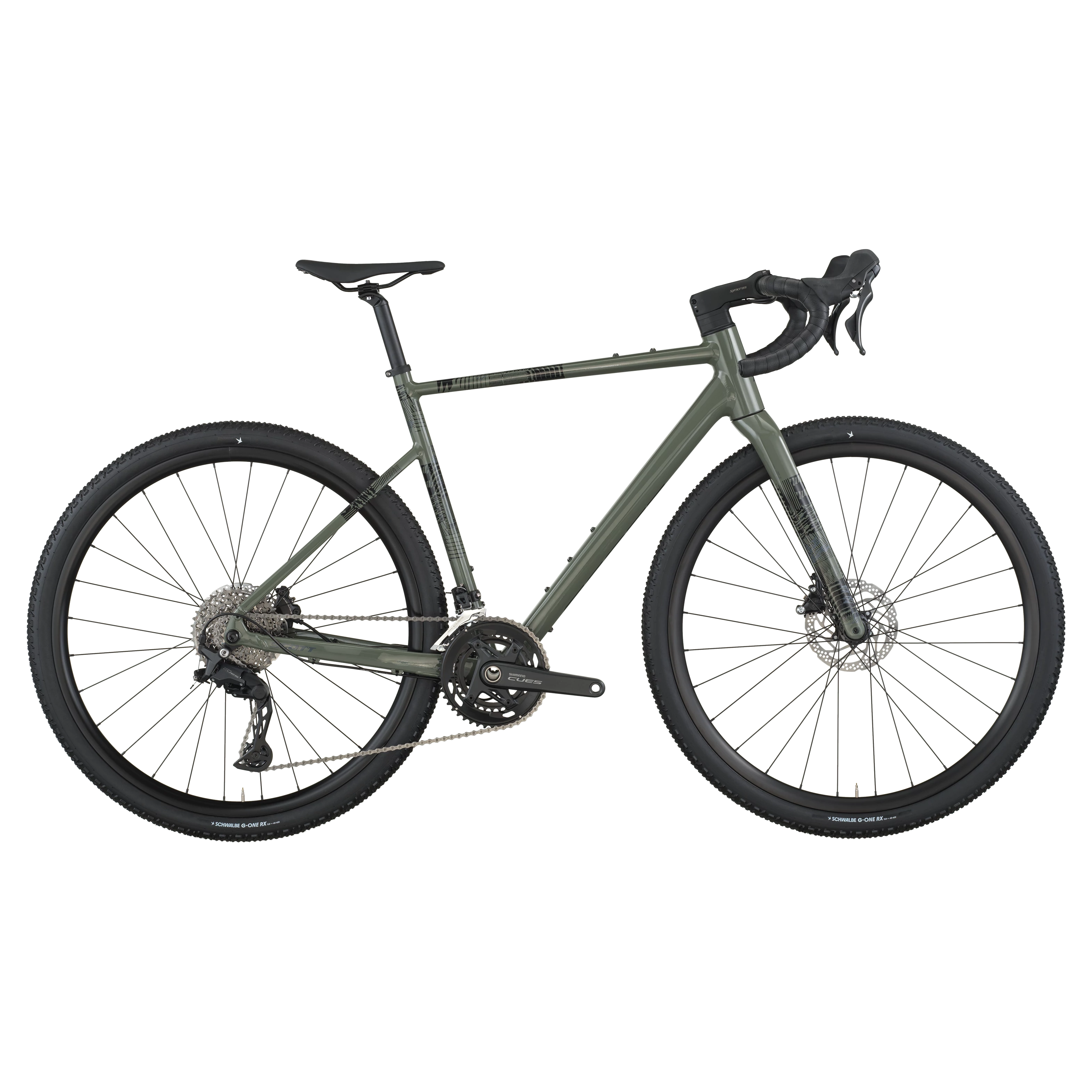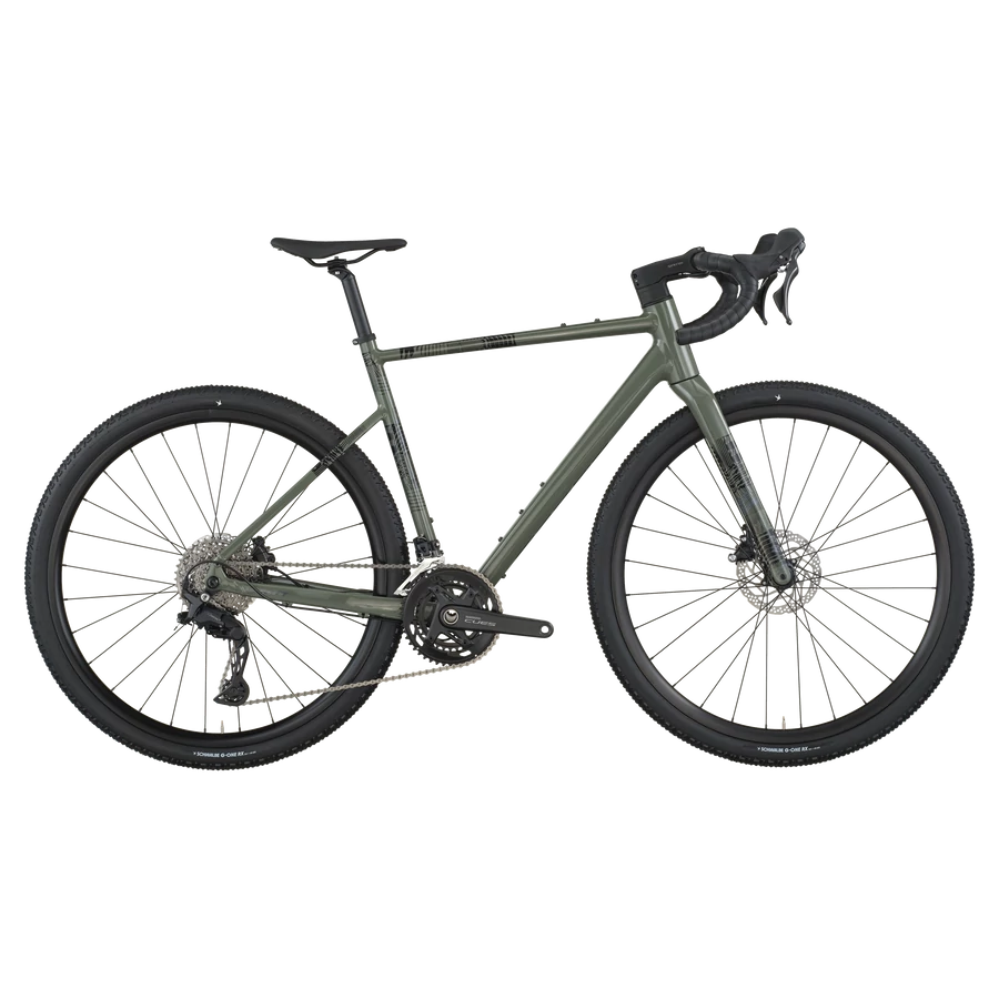 A hajtásról a Shimano CUES 6000 2x10 rendszer gondoskodik (20 fokozat): a 46/32 hajtómű és a 11–39 kazetta jól használható áttételtartományt ad síkon és emelkedőn. A Shimano hidraulikus tárcsafék (160/160 mm rotor) kiszámítható fékerőt nyújt, a Schwalbe G-One RX 700x45C külsők pedig kifejezetten gravel használatra valók, biztos tapadással és kiváló gördüléssel.